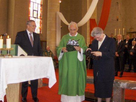 Niet zonder reden gingen twee priesters voor in de viering, kapelaan Roger Maenen en pater Piet Derckx. Dat bleek toen Frits Berben, voorzitter van de Werkgroep Torenrenovatie Meijel, kort voor de slotzegen een toespraak hield en een boekje overhandigde aan pater Piet Derckx en zuster Virga Geelen. De Meijelse Piet Derckx werd in 1965 priester gewijd en de Meijelse Mia Geelen werd in 1965 zuster Virga. Na hen hebben geen Meijelsen meer gekozen om geestelijke te worden.
