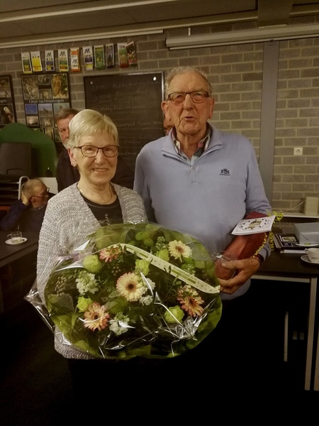 Wim Basten en Alwie Verstappen werden door secretaris Rob Peeters uitvoerig bedankt voor de bewezen diensten. Op de foto zien we Wim en echtgenote Rika, die verblijd werd met een grote bos bloemen.