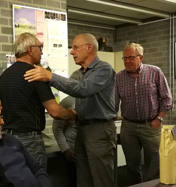 Op bijgevoegde foto zien we Alwie die de hand wordt gedrukt door secretaris Rob Peeters en Tjeu Pouls.