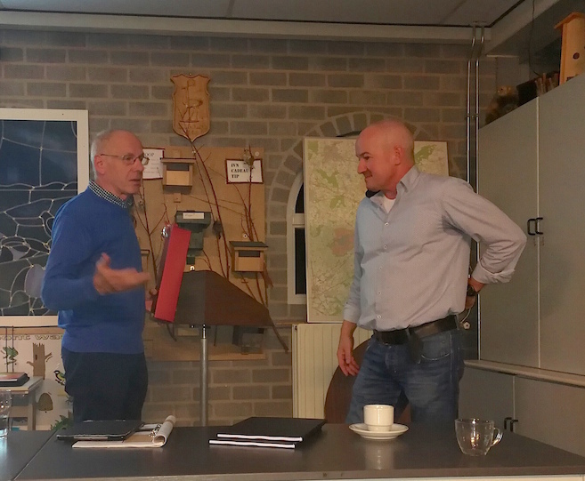 Op de foto zien we rechts Tom van Mierlo die uit handen van Medelo-secretaris Rob Peeters een presentje krijgt aangeboden na afloop van de lezing.