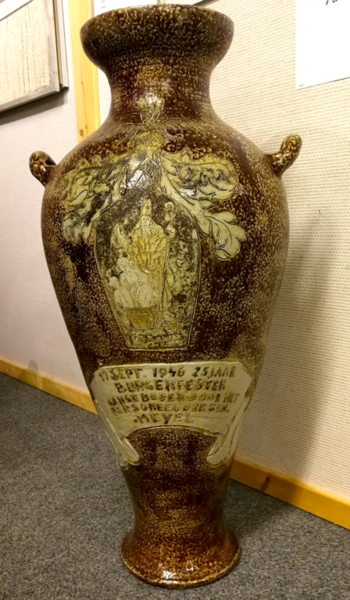 Onlangs ontving Medelo een wel erg bijzonder geschenk. Hans Sanders, zoon van wijlen de Meijelse burgemeester, schonk de vereniging een buitengewoon grote en fraaie vaas uit 1946. De vaas werd gemaakt bij Sint Joris in Reuver en was een geschenk van de gemeentepersoneel bij gelegenheid van het 25-jarig burgemeestersjubileum van Sanders. Centraal bevindt zich het wapen van de gemeente Meijel (met Sint Nicolaas). De vaas heeft een mooie plek gekregen in museum Truijenhof.